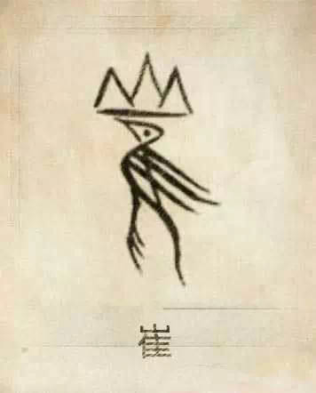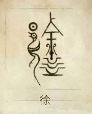 徐姓图腾,徐是淮夷一支的族称,由“余”和“太阳鸟”组成。(左边是玄鸟向日,暗合徐氏始祖由鸟所生的传说。)“余”本是“俞”,类似箭矢的尖锋,它装在天竿华表建木的顶端,指向中天,用它来代表“天齐”(天的肚脐),也就是“中央”。这个形状在7400—7000年前的湖南黔阳高庙遗址的陶器刻符和浙江余姚河姆渡遗址的陶器和骨雕上的刻符上,都已出现为天竿俞。