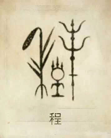 程姓图腾,是炎帝第五世祝融八姓之一的族称,由“禾”和“呈”组成。炎帝神农氏擅长种植谷物,所以程从“禾”。“呈”是“皇”的变体,炎帝是三皇之一,具有司天掌管天表的至上权,这种世职由程姓继承。风姓别支,始祖吴回。