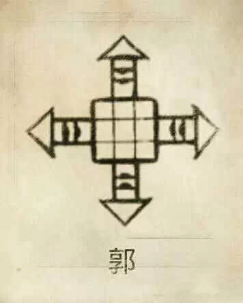 郭姓图腾,一是“郭”象四方的城楼的整体形状,以此为图腾标志。居住在东城的称东郭,居住在西城的称西郭,居住在南城的称南郭,居住在北城的称北郭。二是“郭”,今以为城郭字。按“郭”,篆文左边作两“亭”(省文)上下相对,左边为“邑”(阝)。甲古文原作上下左右四“亭”(省文)相对,中间为囗,象内城。故郭本义似为围墙上之望亭,或会“自内城向外扩展,即外城”之意。“虢”与“郭”音相似。
